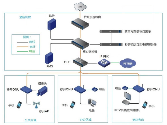 • 酒店智能化 蘇山偉達全光纖智慧酒店解決方案,是通過光纖接入承載酒店所有業(yè)務(wù),可有效的解決多網(wǎng)多線纜的問題。“三網(wǎng)合一”是本方案的核心價值。組網(wǎng)特點與要求酒店上網(wǎng)人流量大,流動性大,內(nèi)網(wǎng)復(fù)雜,帶寬要求高,穩(wěn)定性要求高??腿穗S時隨地方便上網(wǎng),互不干擾。IPTV、固定電話、監(jiān)控、上網(wǎng)及物...