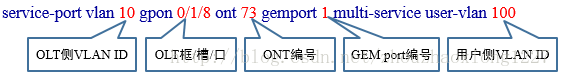 MA5680T(config)#service-port vlan 10 gpon 0/1/8 ont 73 gemport 1multi-service user-vlan 100 將USER-VLAN為100映射到service-port vlan 為10上面,可以從10的vlan里面拿到數(shù)據(jù),100為tr069管理業(yè)務(wù) MA5680T(config)#service-port vlan 1000 gpon 0/1/8 ont 73 gemport 2multi-service user-vlan 200 將USER-VLAN為200映射到service-port vlan 為1000上面,可以從1000的vlan里面拿到數(shù)據(jù),200為INTERNET業(yè)務(wù) MA5680T(config)#service-port vlan 1000 gpon 0/1/8 ont 73 gemport 2multi-service user-vlan 300 將USER-VLAN為300映射到service-port vlan 為1000上面,可以從1000的vlan里面拿到數(shù)據(jù),300為INTERNET業(yè)務(wù)
